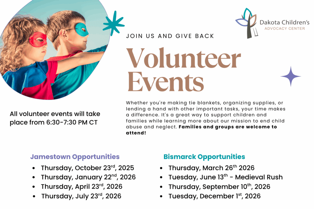 Thank you for your interest in volunteering at the Dakota Children’s Advocacy Center (DCAC). In order to provide services free to families, the DCAC truly depends on the help of volunteers. Volunteers who contribute their unique talents, skills and knowledge to help restore hope, health and healing to children and their families are sincerely appreciated.